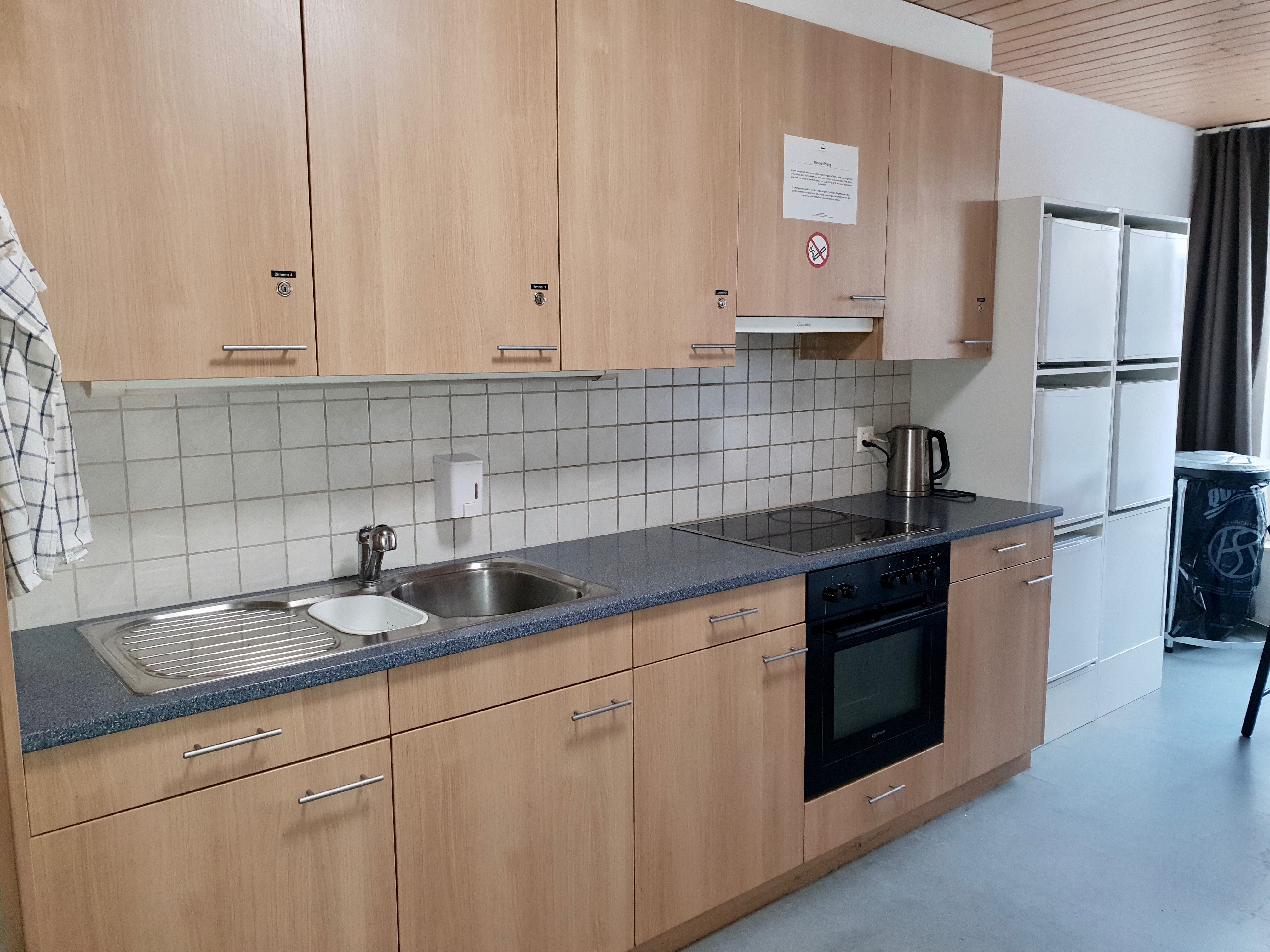 Küche: Allgemeinküche | Kochutensilien | privater Kühlschrank | Vorratsfach mit Geschirr/Besteck.